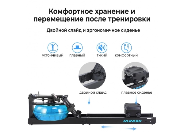 Для удобства перемещения предусмотрены транспортировочные ролики. Тренажер воздействует на все группы мышц тела. Размеры в собранном виде составляют 56x49x194 сантиметров. Система нагрузки - водная, а регулировка нагрузки также осуществляется изменением уровня воды в баке. Длина слайда составляет 104.5 сантиметра.