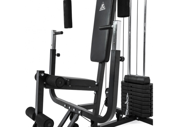 Комплекс для домашнего использования DFC D7010 предназначен для силовых упражнений на все группы мышц, благодаря большому количеству функций. На нём можно выполнять жим от груди сидя и лёжа, тягу верхнего и нижнего блока, приседания, подтягивания, разгибания ног и многие другие упражнения. Силовая нагрузка В комплектацию входит весовой стек, расположенный сзади от скамьи. Общий вес — 40,5 кг: 9 пластин по 4,5 кг. Вес регулируется при помощи специального фиксатора. Плавность движения стеков гарантируют ролики на подшипниках. Тренажёр изготовлен на основе прочной трубы с размерами профиля 45 х 45 х 1,5 мм.